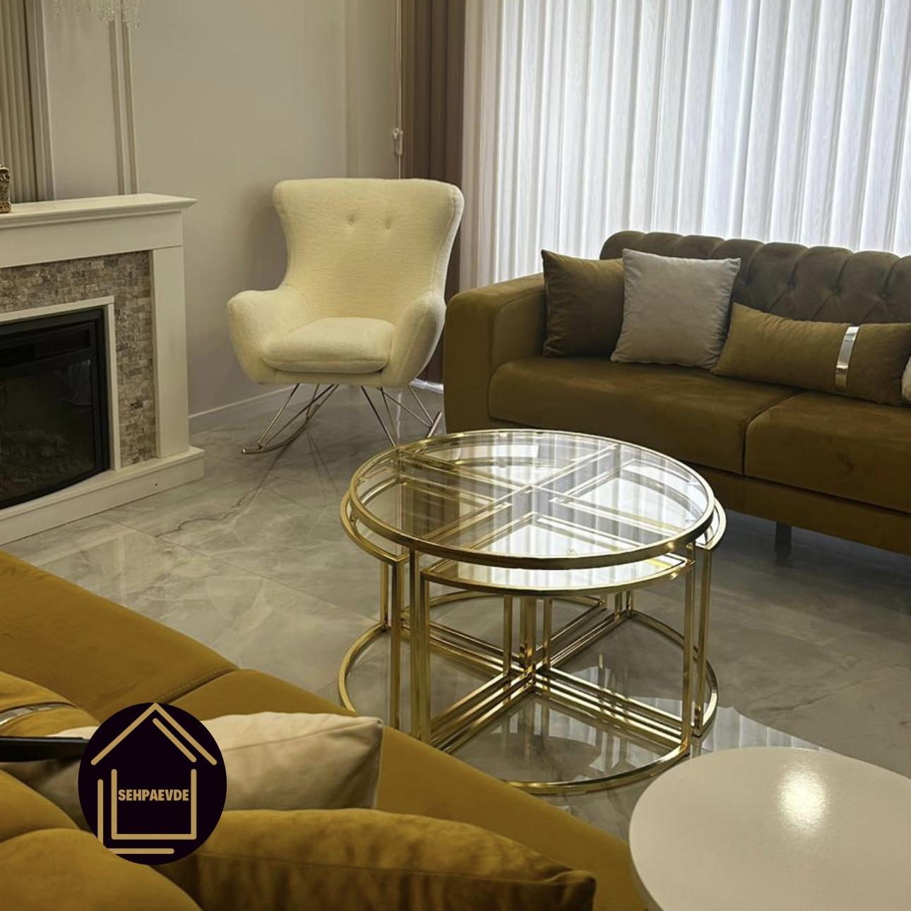 PARLAK GOLD YUVARLAK 4+1 PİZZA ORTA SEHPA ÜST ŞEFAF CAM ALT KLASİK AYNA