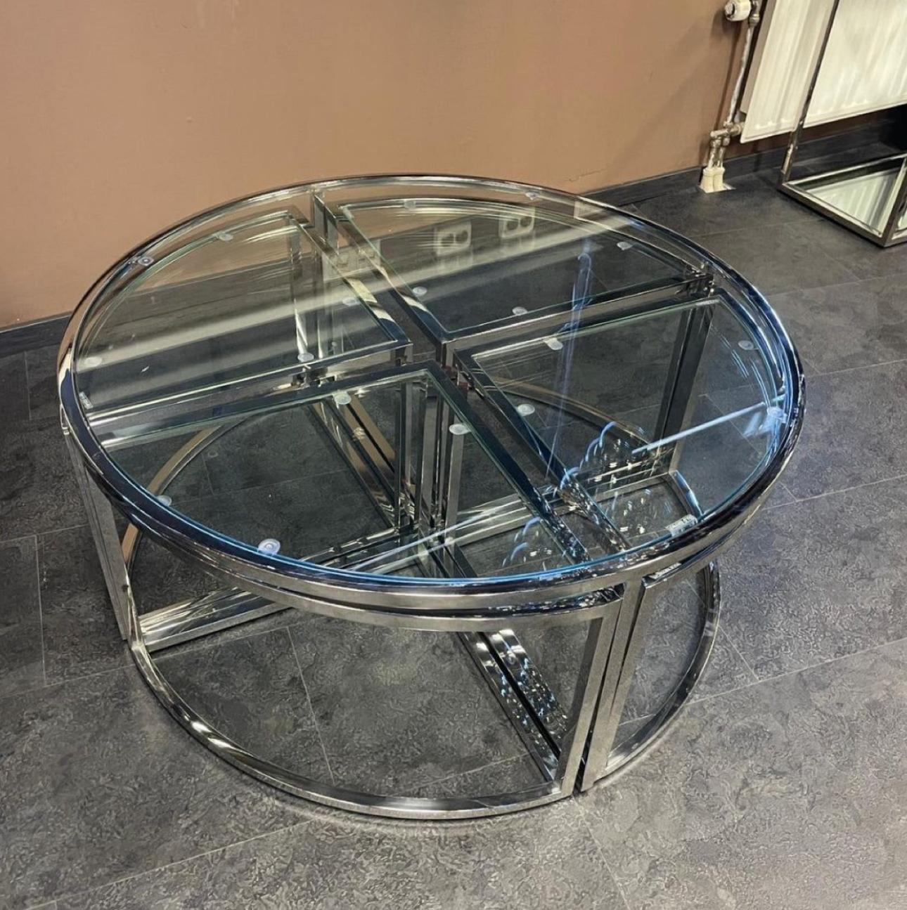 PARLAK KROM YUVARLAK 4+1 PİZZA ORTA SEHPA KOMPLE ŞEFAF CAM